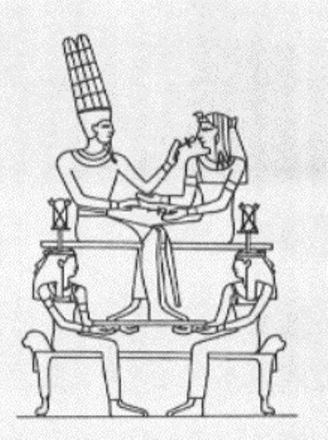 Le Créateur (Imana/Amon/Amen) prend conscience et connaissance de la future femme qu’il a choisie pour enfanter l’enfant divin, le futur roi. Il prend connaissance de la future reine mère, la reine mère étant l’incarnation d’Aïssata (Isis). Dans la tradition Aïssata est la vierge mère qui a enfanté Horo (Horus), l’enfant divin qui doit prendre le pouvoir. Cela est figuré ici par cette scène où on voit Imana (Dieu) avec la double-plume tenant la main de Djehouty (Thot), qui est une de ses formes, et qui incarne la science et la connaissance divine.Imana assis en face de celle qui doit tomber enceinte (ici la reine Yahmessou, mère d’Hatchepsout), s’unit spirituellement à elle et insuffle la vie du nouvel enfant divin dans son sein, pour que naisse le nouveau roi. La femme est donc fécondée par l’intervention divine. C’est l’immaculée conception. Imana va mobiliser ses énergies créatrices pour façonner l’enfant dans le sein de sa mère.Le Créateur – ici sous sa forme totémique du bélier et à travers ses principes masculin et féminin – modèle l’enfant physiquement et spirituellement dans le sein de sa mère. Les entités physiques et spirituelles de l’enfant sont symbolisées par cette forme humaine double et identique sur laquelle le Créateur agit. Le bélier modèle donc son fils l’agneau. Voilà pourquoi le pharaon est l’agneau de Dieu. Le Créateur, envoie une de ses manifestations (ici Djehouty), pour annoncer à la femme en question qu’elle a été choisie par Lui pour enfanter le fils de Dieu, l’enfant divin (c’est à dire le pharaon).La future mère du futur roi est visitée et conduite sur le lieu de l’accouchement.La reine mère au centre ici de l’image donne naissance à l’enfant divin, l’enfant roi.L’enfant est présenté spirituellement au Créateur, qui le bénit.L’enfant roi est aussi présenté physiquement et spirituellement aux ancêtres, il subit des cérémonies, etc…